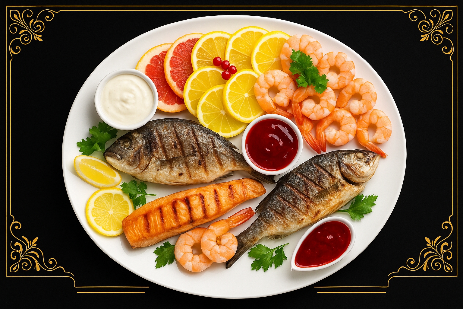 Набор «Русалочка» — семга, сибас, дорадо и креветки на углях с цитрусовыми, белым и гранатовым соусом.
