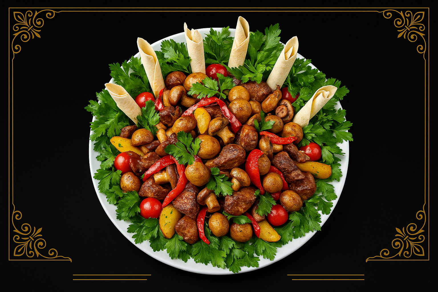 Садж от шефа — сытное и эффектное блюдо для большой компании. На раскалённом садже подаются сочные кусочки говядины, запечённый картофель, ароматные грибы, сладкий болгарский перец и спелые томаты черри. Всё дополняется свежей петрушкой и тонким лавашом. Блюдо рассчитано на 5 человек, а общий вес достигает 2000 г.