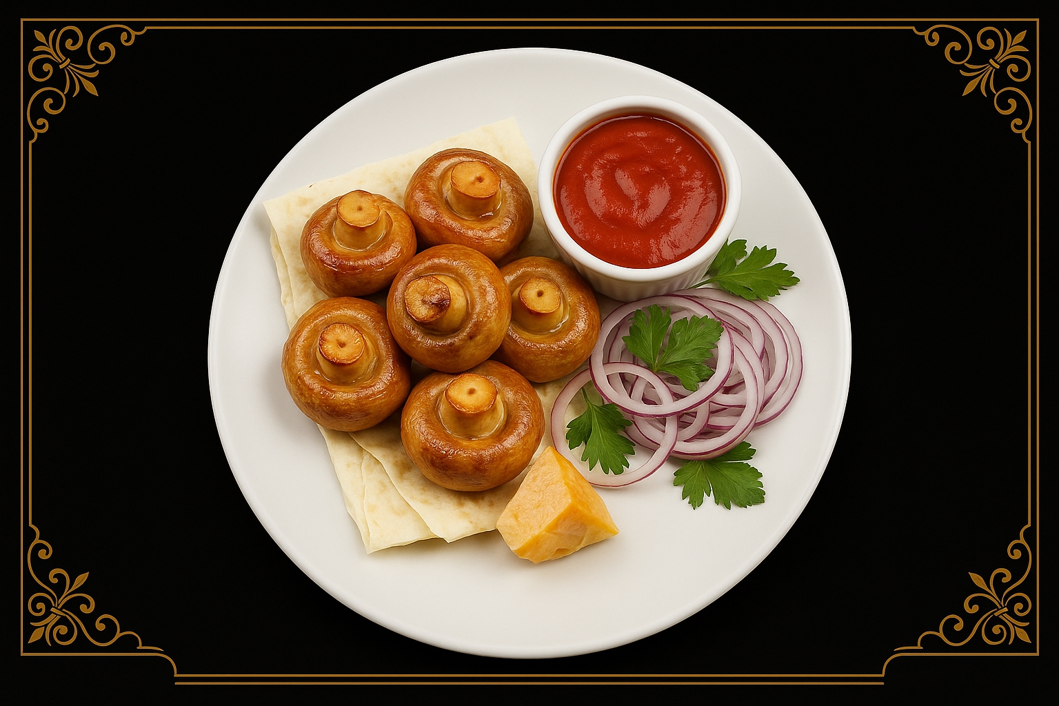 Шампиньоны на углях — сочная и ароматная закуска, приготовленная на открытом огне. Грибы прожариваются до лёгкой румяной корочки, сохраняя внутри нежность и природный вкус. Аромат дымка делает блюдо особенно аппетитным. Подаются шампиньоны украшенные свежей зеленью — просто, вкусно и по-домашнему.