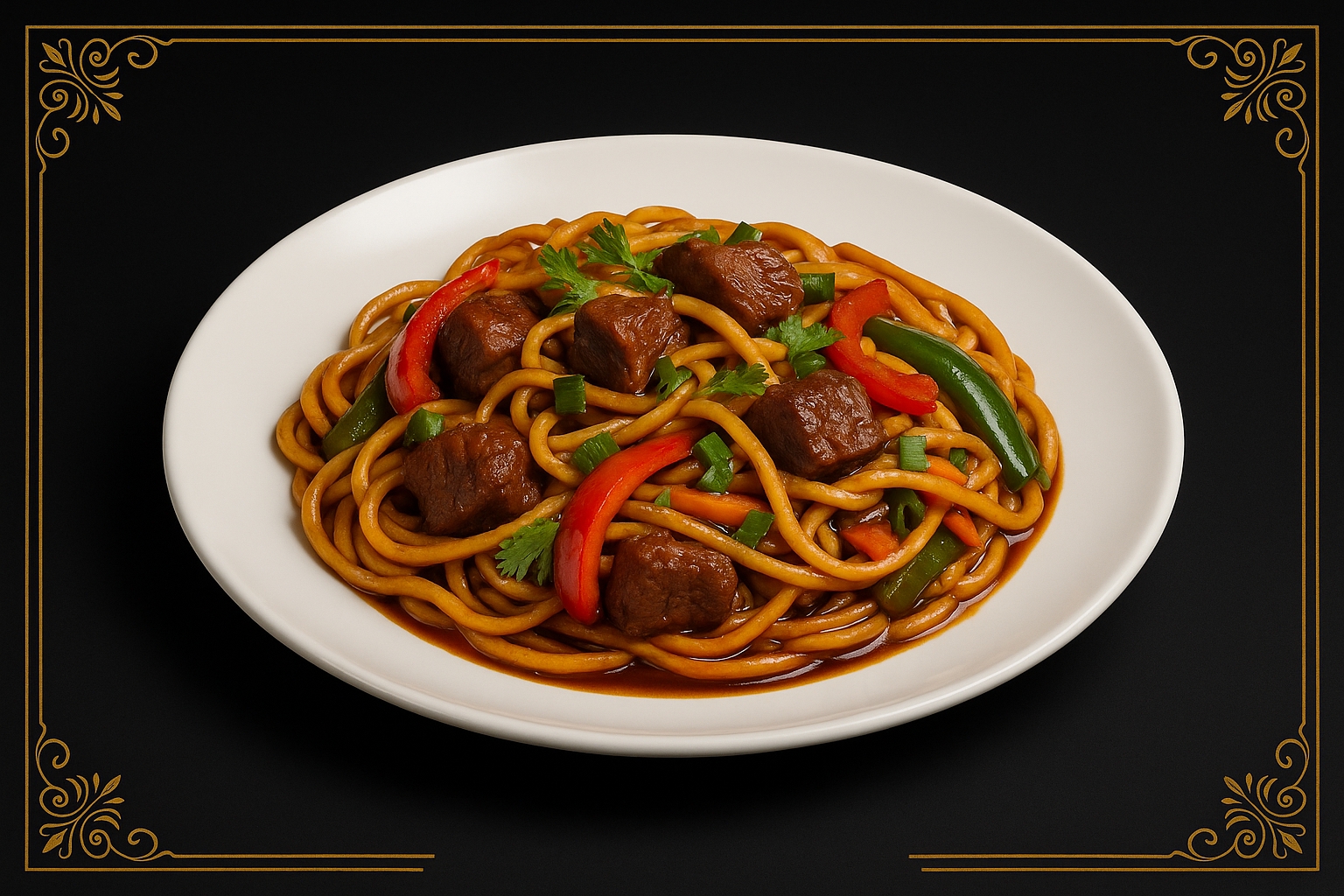 Жареный лагман — сытное и ароматное блюдо восточной кухни, приготовленное с овощами, мясом и лапшой. В его составе — сочная говядина, болгарский перец, кабачки, стручковая фасоль, помидоры и лапша лагман. Стебель сельдерея и свежая петрушка придают блюду особый аромат и лёгкость.